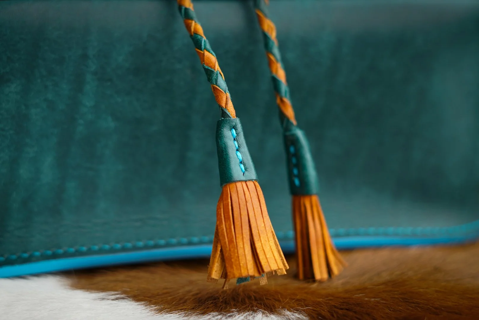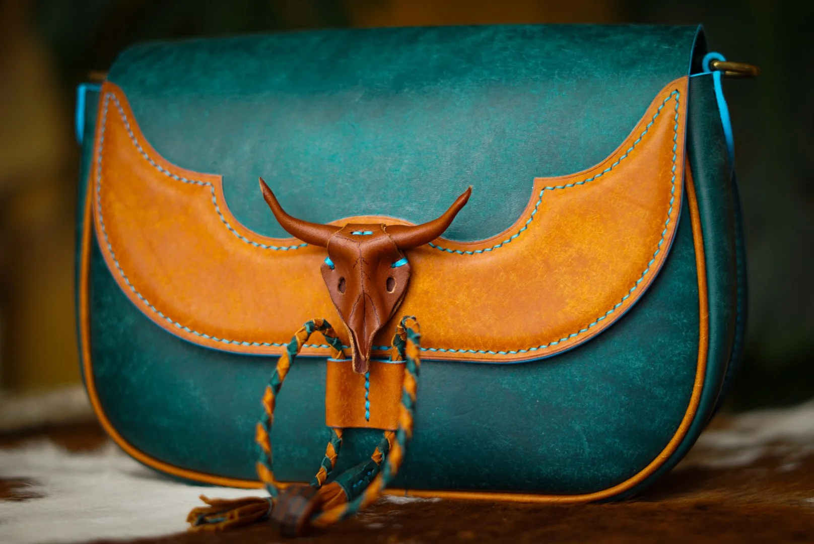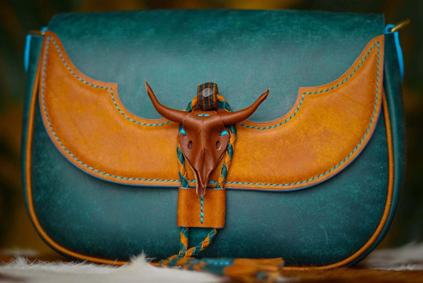 The hand-sculpted cow skull is the centerpiece of this thoroughly modern Western bag, and the heart that I designed the rest of the bag around. In keeping with the timeless western look, I cut lace from the same hides used for the body and hand-braided cord to lasso around the cow skull, securing the bag closed.