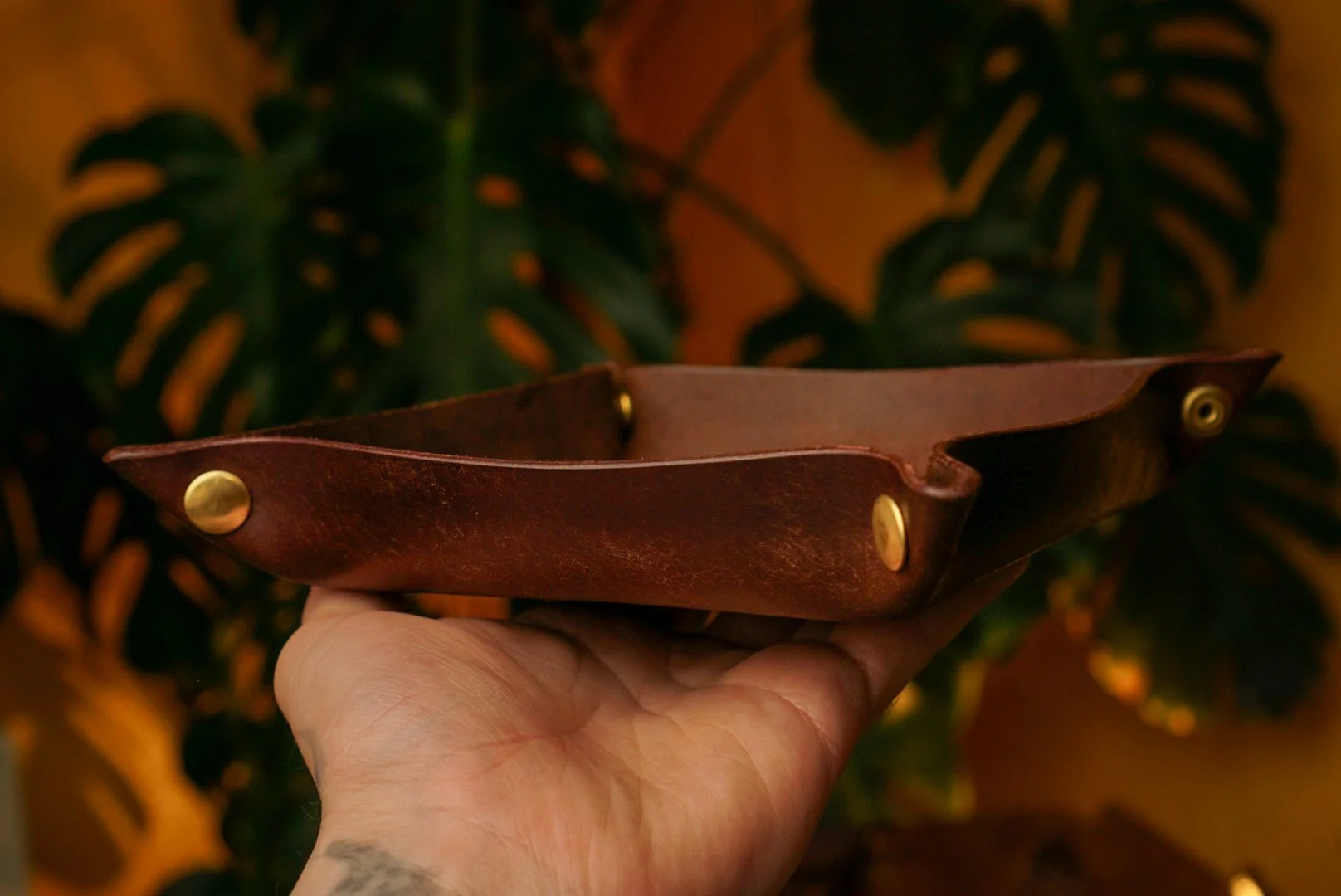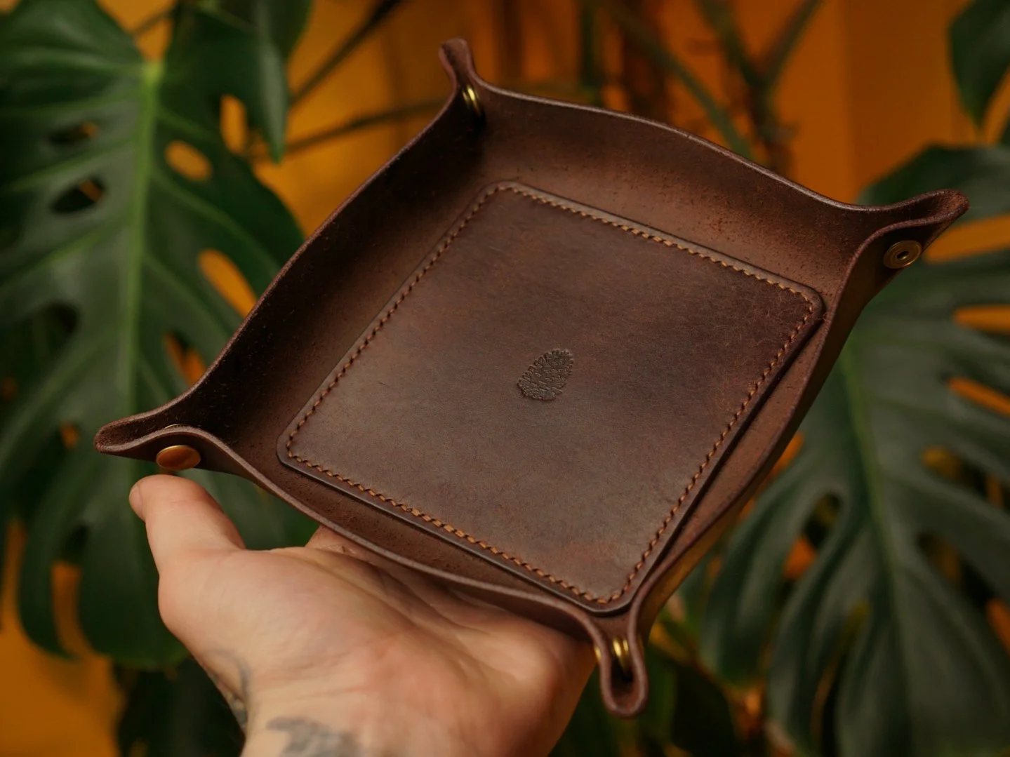 Snapped or riveted, the tray measures 7.75" x 7.75" with a 6" base—perfect for keys, coins, watches, and small accessories.
